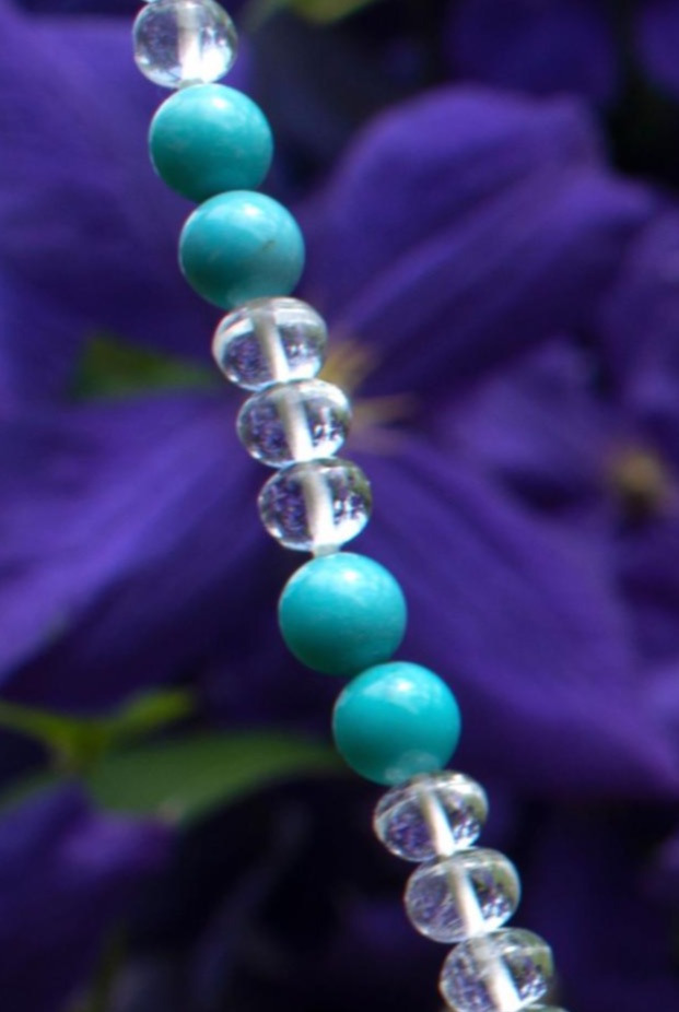 Working with White Beryl paired with symbiotic Turquoise in a necklace or bracelet is one of the easiest natural ways to keep your energy field free of unwanted thoughts and emotions of others—and your own.