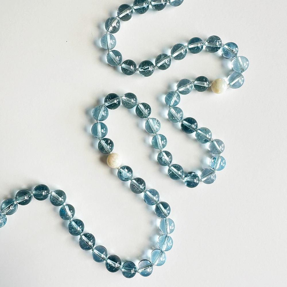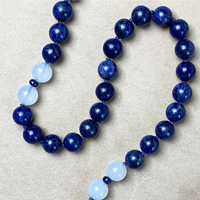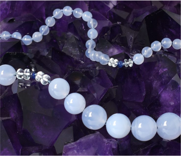 As a necklace, Blue Chalcedony’s cooling nature gently relaxes the mind, allowing it to open to receive nourishment. This can encourage new ideas, greater creativity, and more consistent outflow with fewer mental blocks.