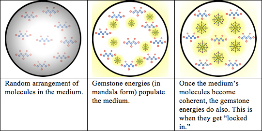The mandala’s energy field promotes and fine-tunes the molecular structuring of the alcohol to become an optimally receptive medium for the gemstone energies. As the structuring occurs, the gemstone energies move in. They populate the structure by surrounding each molecule (see graphic below). The structure also serves to keep the gemstone energies in place, with a conservative shelf-life of about eighteen months.