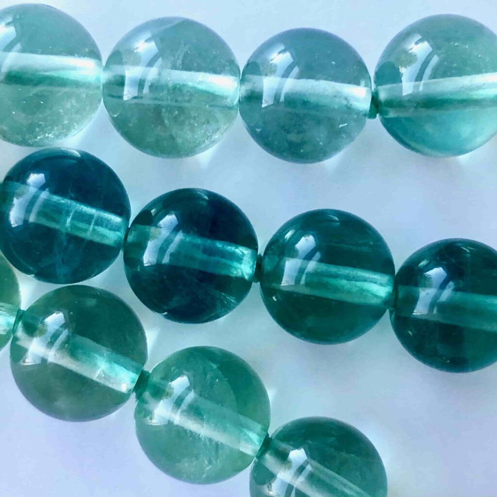 Blue-green fluorite healing also has thermo-luminescence. This means that it will glow when heated. The amount of heat required is not very high. If you bring your necklace into bed with you and your body gets particularly warm, peek under the blankets and you can see the gems luminesce in complete darkness.